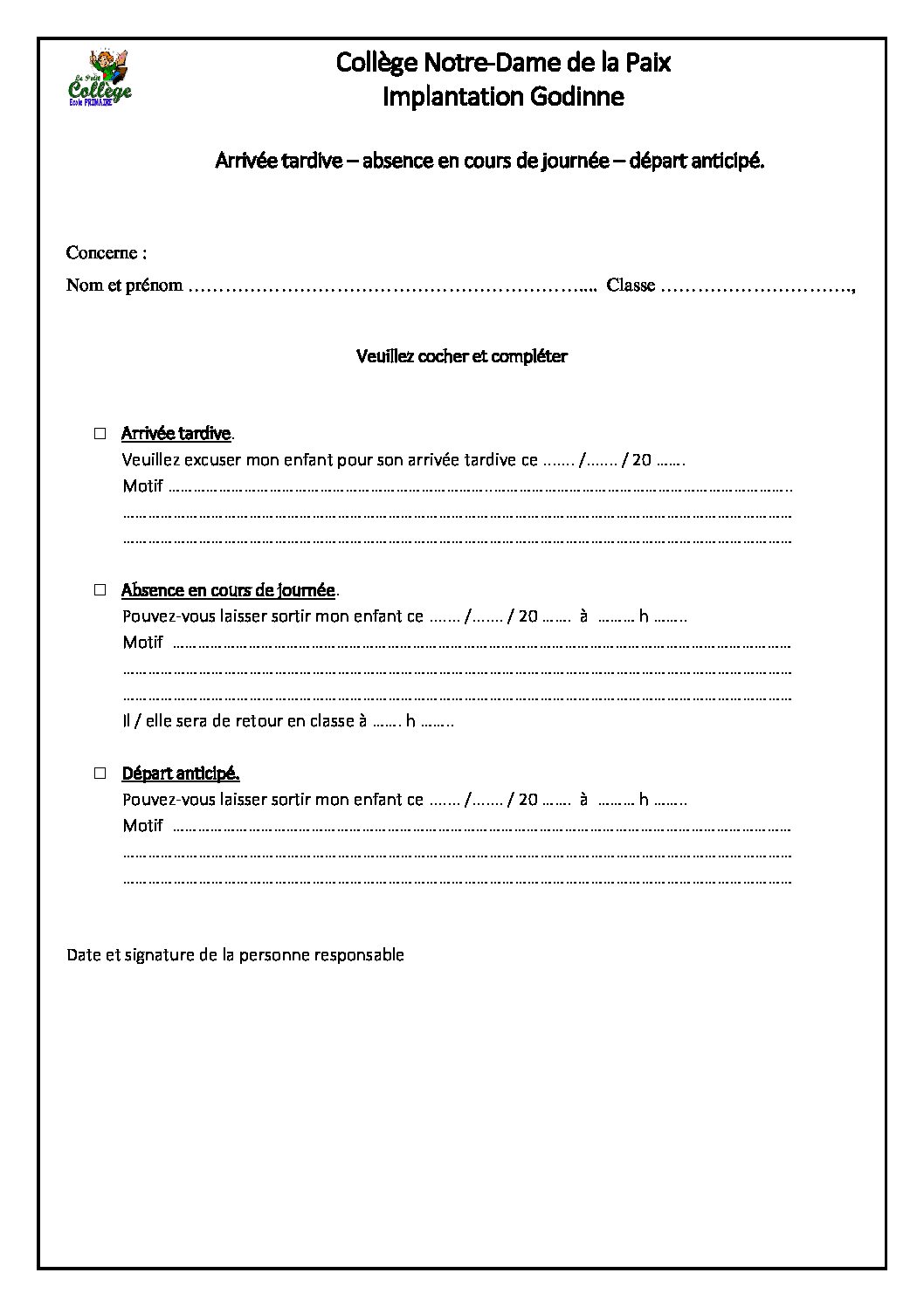 Justificatif d’absence d’un jour et plus Télécharger le document d’Erpent Télécharger le document du Petit Collège de Godinne Arrivée tardive ou départ anticipatif Télécharger le document d’Erpent Télécharger le document du Petit Collège de Godinne