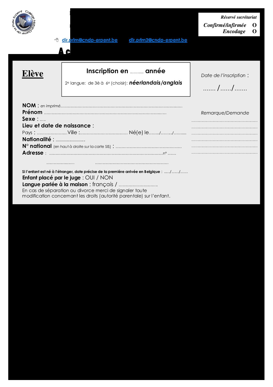 Fiche d’inscription en maternelle Fiche d’inscription en Primaire à Erpent Fiche d’inscription en Primaire au Petit Collège de Godinne